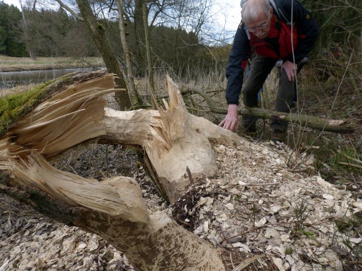 Dann übernahm Karl Paulus das Kommando. Der BN-Kreisgeschäftsführer und Projektleiter des Biberprojekts führte die Exkursionsgruppe in einem langen Gänsemarsch zu einem Biberrevier an der Eger bei Hebanz. Schon nach kurzer Strecke entdeckten die mitfiebernden Kinder die ersten Fraßspuren von „Meister Bocklet“: keilförmig abgenagte Weidenstämme, kahlgenagte Äste, grabenförmige Ausstiege und eine große gefällte Zitterpappel. Der enorme Kaudruck der Biberzähne von 120 Kilogramm pro Quadratzentimeter macht das möglich.