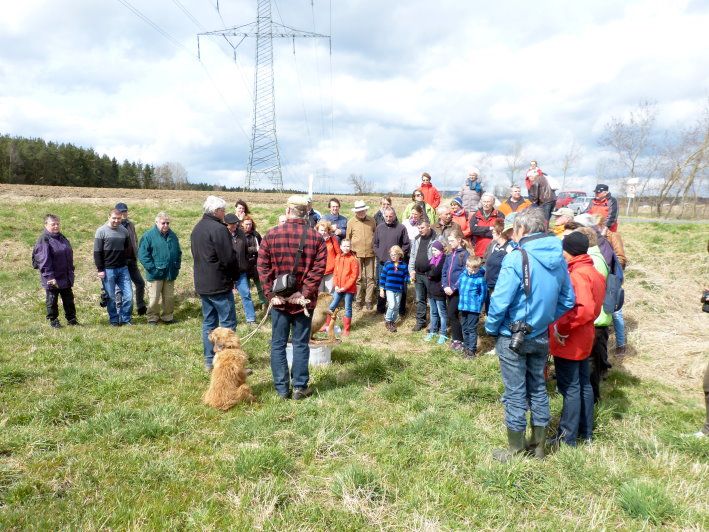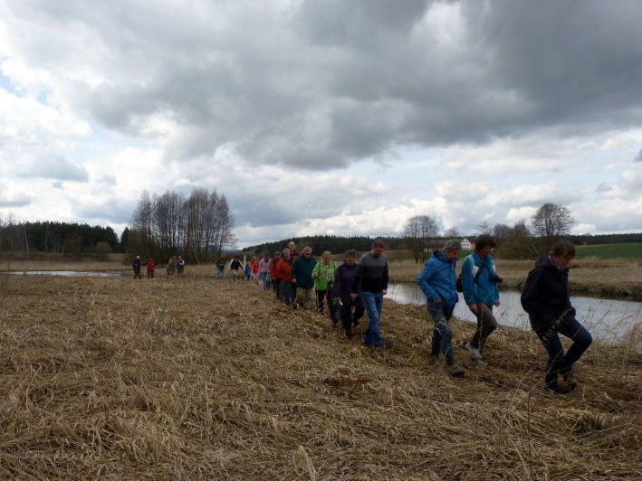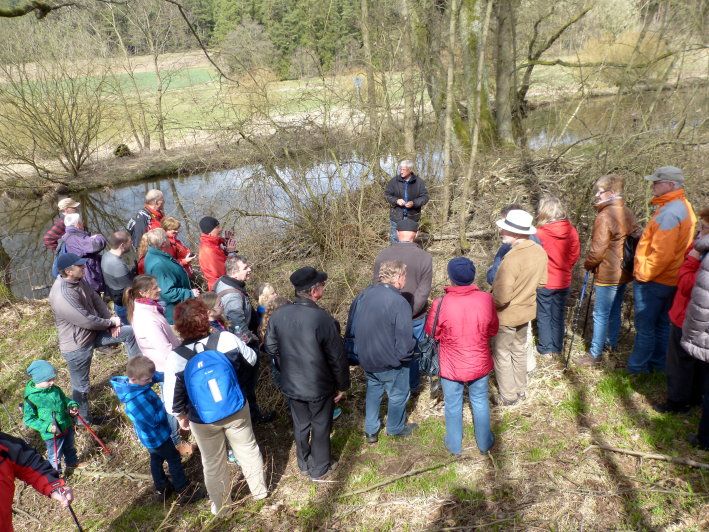 Die Exkursionsgruppe wanderte flussaufwärts durch die wunderschöne, naturnahe Egeraue zu einem zweiten Biberrevier unterhalb von Marktleuthen. Auch hier die gleichen Merkmale: eindeutige Fraßspuren an Weiden in einem kleinen Auwald, Ausstiege und schließlich ein Biberbau, der allerdings bereits verlassen war. Der Biber legt in seinem Revier häufig mehrere Bauten und Fluchtröhren an, aber nur eine Burg wird „winterfest“ gemacht. Der Biber gestaltet wie keine zweite Art seinen Lebensraum und schafft damit gleichzeitig Lebensraum für zahlreiche Tier- und Pflanzenarten in und am Gewässer: für Amphibien, Libellen und Fische, sowie für Schwarzstorch und Eisvogel. Biberreviere dienen auch der Wasserrückhaltung und dem Hochwasserschutz.