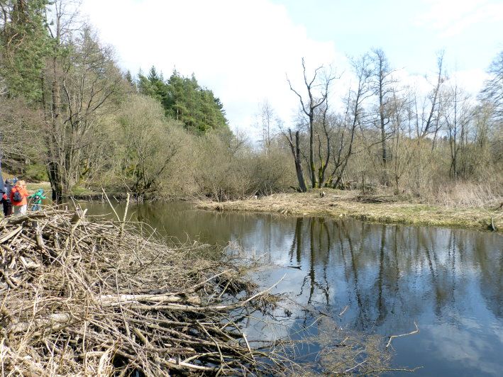 Nachdem sich die zahlreichen Teilnehmer durch gefällte Bäume an einem Egersteilhang durchgekämpft hatten, tauchte schon bald die Biberburg auf, die sich für den Laien wie ein großer Reisighaufen darstellt. Der Eingang zum Biberbau liegt stets unter Wasser und die Biberfamilie ist in einem rund einem Meter breiten Wohnkessel zu Hause. Eine Familie besteht aus den Bibereltern und den Jungtieren der letzten beiden Jahre. Danach müssen sich die Jungen ein eigenes Revier suchen. Finden sie das nicht, hat der Biber keine Überlebenschance. Dadurch ist eine übermäßige Vermehrung, wie bei den Wildschweinen, nicht möglich.