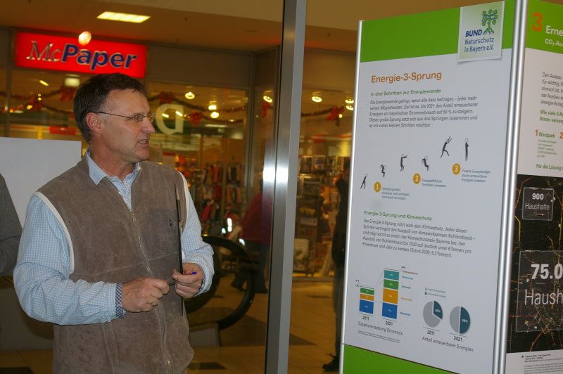 Die erforderlichen drei Schritte wie Energieeinsparung, effiziente Energienutzung und Förderung der erneuerbaren Energien stellt die Ausstellung des BUND Naturschutz in den Mittelpunkt. Das Ausstellungskonzept wurde vom Landesamt für Umwelt entwickelt und realisiert.