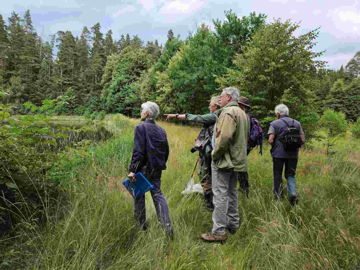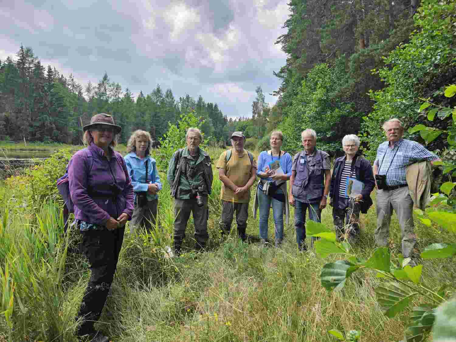 Die Sonne zeigte sich kaum, trotzdem waren einige der schillernden Flugobjekte, um die es gehen sollte, in der Luft. „Libellen brauchen als wechselwarme Insekten relativ hohe Temperaturen, um fleißig fliegend unterwegs zu sein“ so Jürgen Fischer. „Hier am Herrenoberweiher wurden bereits 21 Libellenarten nachgewiesen – bei ca. 50 Arten im Fichtelgebirge – ist das schon nicht schlecht“ so der Experte. Der Lebensraum bietet einen großen Strukturreichtum, und sorgt so für Artenvielfalt, auch unter den Libellen. Ob Große Pechlibelle, Blutrote Heidelibelle oder Vierfleck – sie alle haben unterschiedliche Ansprüche an ihren Lebensraum und können im Weiher bei Kaiserhammer gute Bedingungen finden. „Manche Arten legen ihre Eier direkt ins Wasser, andere an Wasserpflanzen unter und über der Wasseroberfläche. Die vorhandenen Verlandungszonen des Gewässers sind ebenfalls sehr wertvoll für den Lebenszyklus der agilen Insekten", so Fischer. "Grundsätzlich könne man bei der Bestimmung zwischen Groß- und Kleinlibellen unterscheiden. Was jedoch alle Arten bei der Fortpflanzung gemein haben ist die Bildung eines Paarungsrades“. Um die Paarung vollziehen zu können verbinden sich Weibchen und Männchen in stark gekrümmter Haltung zu einer Rad- oder Herzfigur. „Die Tiere sind wahre Flugkünstler“ so Fischer. „Sie fangen meist auch ihre Beute im Flug mit den Beinen und können die vier Flügel unabhängig voneinander bewegen, was sie sehr beweglich macht.“ Während die adulten Libellen im Luftraum den Ton angeben, jagen ihre Larven mit Hilfe eines speziellen Mundwerkzeuges, der „Fangmaske“ unter Wasser. „Ein bis drei Jahre leben die meisten Libellenlarven so unter Wasser oder im Schlamm. Als Erwachsene werden die geflügelten Juwelen jedoch nur wenige Wochen alt.“ weiß der Libellenliebhaber.