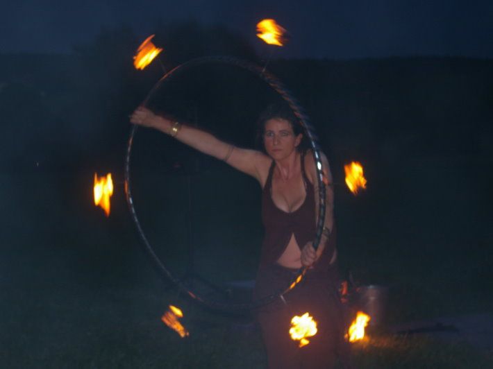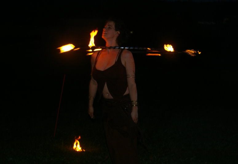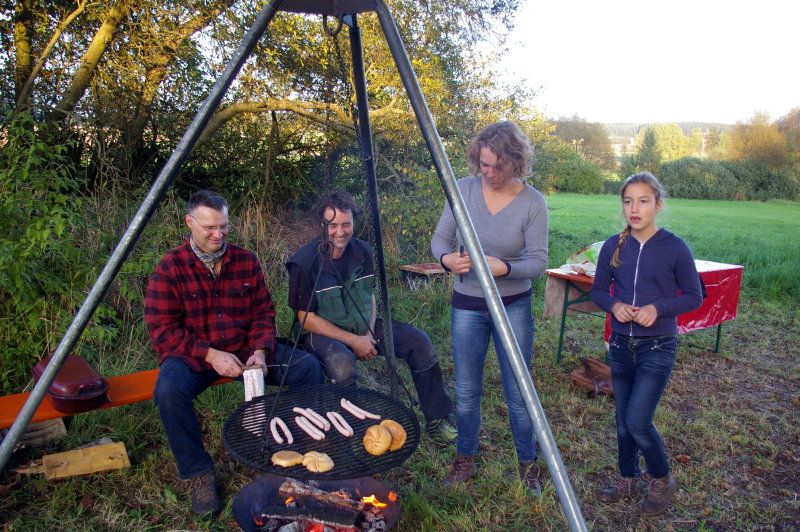 Natürlich war auch für das leibliche Wohl der Besucher gesorgt. Inge Heinrich und und ihre Helferinnen und Helfer boten Kaffee und Kuchen, Brotaufstriche und Häppchen für die Besucher an. Fred Terporten-Löhner kredenzte Rehbraten vom Grill. Mit einer fulminanten Feuershow von „Lady Firesmile“ Silvia Schraml mit Fackeln und einem Feuerrad endete die nicht alltägliche Aktion von Kunstschaffenden und Naturschützern. Das Publikum war begeistert. Am Lagerfeuer klang die außergewöhnliche Kunstaktion „Kraftquelle Natur“ dann gemütlich aus.