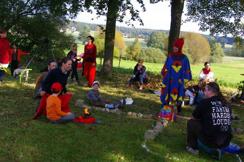 Das Grundmuster des Labyrinths wurde in einem ersten Workshop am frühen Nachmittag mit Choreographie und Musik festgelegt. Den Abschluss der Kunstaktion im Labyrinth bildete eine feierliche Begehung des Labyrinths am Abend. Die Künstlerin Heike Arndt verstand es wunderbar, das Kunstwerk unter Einbeziehung des Publikums mit einer gelungenen Performance stimmungsvoll einzuweihen. In dem herrlichen Ambiente am Schlößlein herrschte eine heitere, stimmungsvolle Atmosphäre.