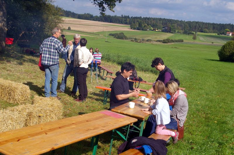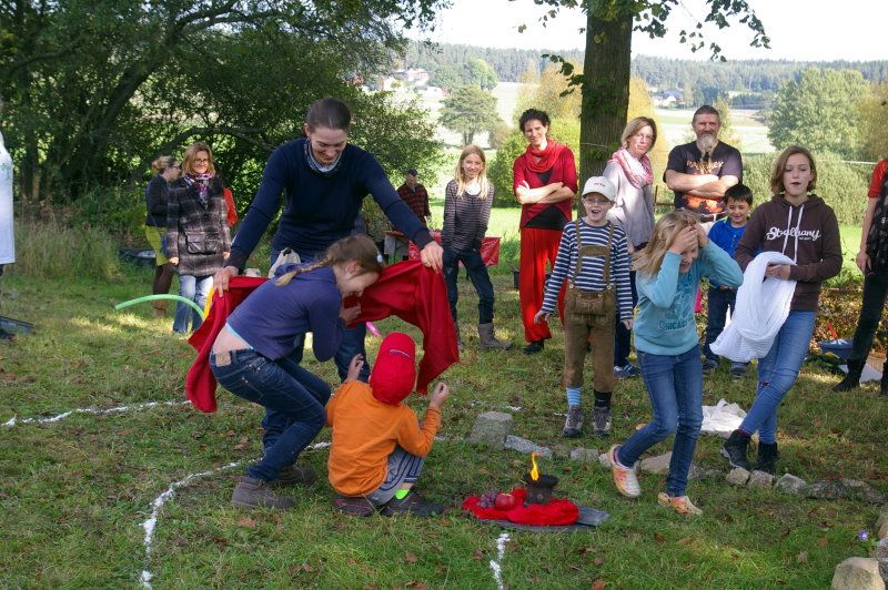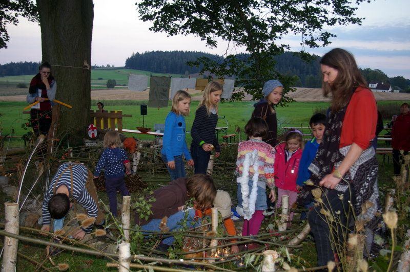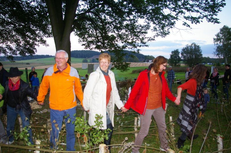 Im Zentrum der Kunstaktion stand ein Elemente-Labyrinth nach einem Konzept von Heike Arndt. Unter dem Motto FEUER// ERDE// WASSER// LUFT wurden verschiedene Stationen errichtet, womit die Besucher zum künstlerischen Schaffen mit Naturmaterialien eingeladen wurden. Im Laufe des Nachmittags entstand mit vielen kleinen und großen Teilnehmern unter der Leitung von Annette Hähnlein und Nepomuk Neidig ein sehr schönes Labyrinth aus Birkenstämmchen, Ästen, Stauden und anderen Naturmaterialien. Im Zentrum des Labyrinths wurde ein Steinkreuz aus Feldsteinen gestaltet.