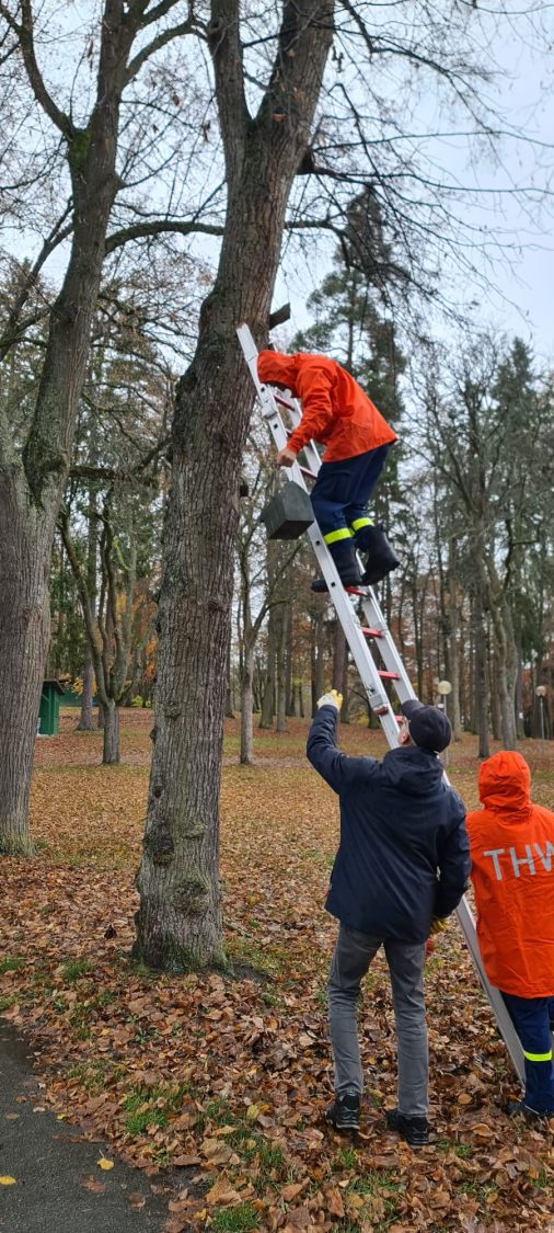 Einen Einsatz der anderen Art hatte die Jugendgruppe des THW am Goldberg. Die sechs Jugendlichen unter Leitung von Klaus Prucker halfen der Ortsgruppe Selb des BN beim Säubern der dort angebrachten Nistkästen. Die Gemeinschaftsaktion klappte vorzüglich. Zwei Teams des THW stellten die Leitern auf, hingen die Nistkästen ab (erster Kommentar: "die sind aber schwer") und brachten sie nach der Säuberung wieder an. Gereinigt und auf den Inhalt geprüft wurden die insgesamt 16 Nistkästen von Willi Meister.