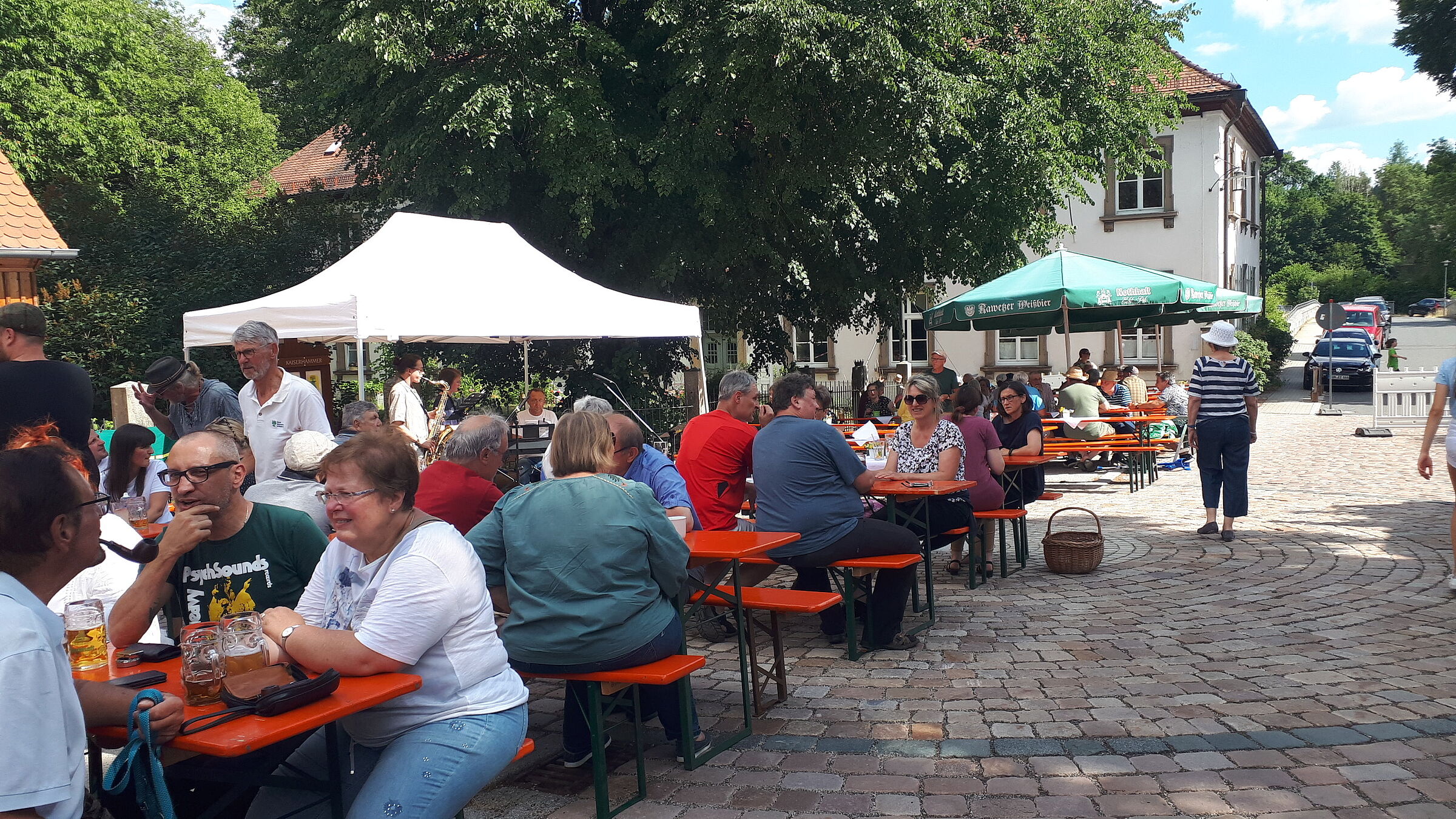 Trotz hoher sommerlicher Temperatur war der Platz zwischen Schloss und Tanzsaal durch Bäume, Sonnenschirme oder weiße Wölkchen immer gut beschatet. Lecker, meist vegetarische, Speisen, regionale Getränke und jazzige Musik der Musikschule Tirschenreuth liesen keine Wünsche offen.