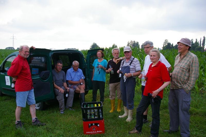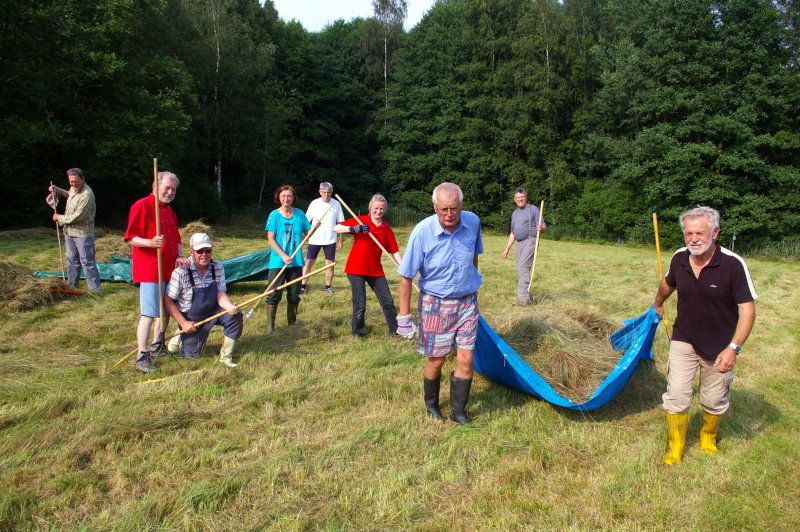 Das dritte Foto zeigt BN-Aktivisten beim Abräumen einer ökologisch wertvollen Magerwiese im Hammerbachtal unweit von Vordorf. Auf dem botanisch hochwertigen Sonderstandort kommen sage und schreibe 13 Pflanzenarten der Roten Liste vor.