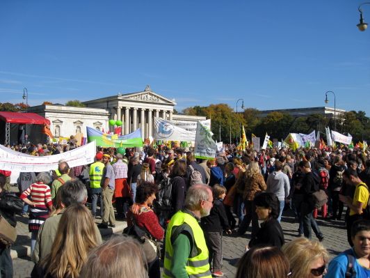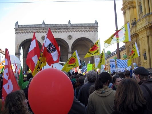 Die Sonne strahlte vom Münchener Himmel und ließ Tausende von gelben Aufklebern und Fahnen mit dem Logo ´Atomkraft? Nein Danke´ hell aufleuchten. Als die Gruppe mit dem Wunsiedler BN-Kreisvorsitzenden Fred Terporten-Löhner und Geschäftsführer Karl Paulus an der Spitze den Königsplatz, den Sammelpunkt der Bahnfahrer erreichten, war der riesige Platz mit fast Zehntausend Demonstranten bereits gut gefüllt. Überall traf man auf Menschenmassen, es sollten 50.000 Bürgerinnen und Bürger werden, die ein machtvolles Signal gegen die vorherrschende Atom- und Energiepolitik setzten. Die Wunsiedler und Tirschenreuther Aktivisten reihten sich schließlich in die zehn Kilometer lange Menschenkette in der Brienner Straße ein, die dort ein zehn- bis fünfzehnreihiges, breites Band bildete. Trotz der riesigen Menschenmenge herrschte eine völlig friedliche, gelöste Stimmung. Doch in den Gesichtern der Teilnehmer lag Entschlossenheit, die risikoreiche Atompolitik von Bundes- und Staatsregierung nicht länger hinzunehmen. Nachdem die Umweltaktivisten aus der Region ihren Part in der Menschenkette erfüllt hatten, begab sich die Gruppe zur Schlusskundgebung auf dem Odeonsplatz.
