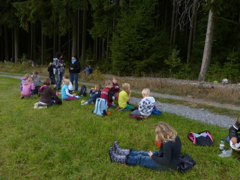 Kleine Spiele dazwischen, wie die Suche nach dem dicksten Baum oder die Verständigung durch Klopfsignale an einem langen Baumstamm ergaben für die Kinder einen erlebnisreichen Vormittag.